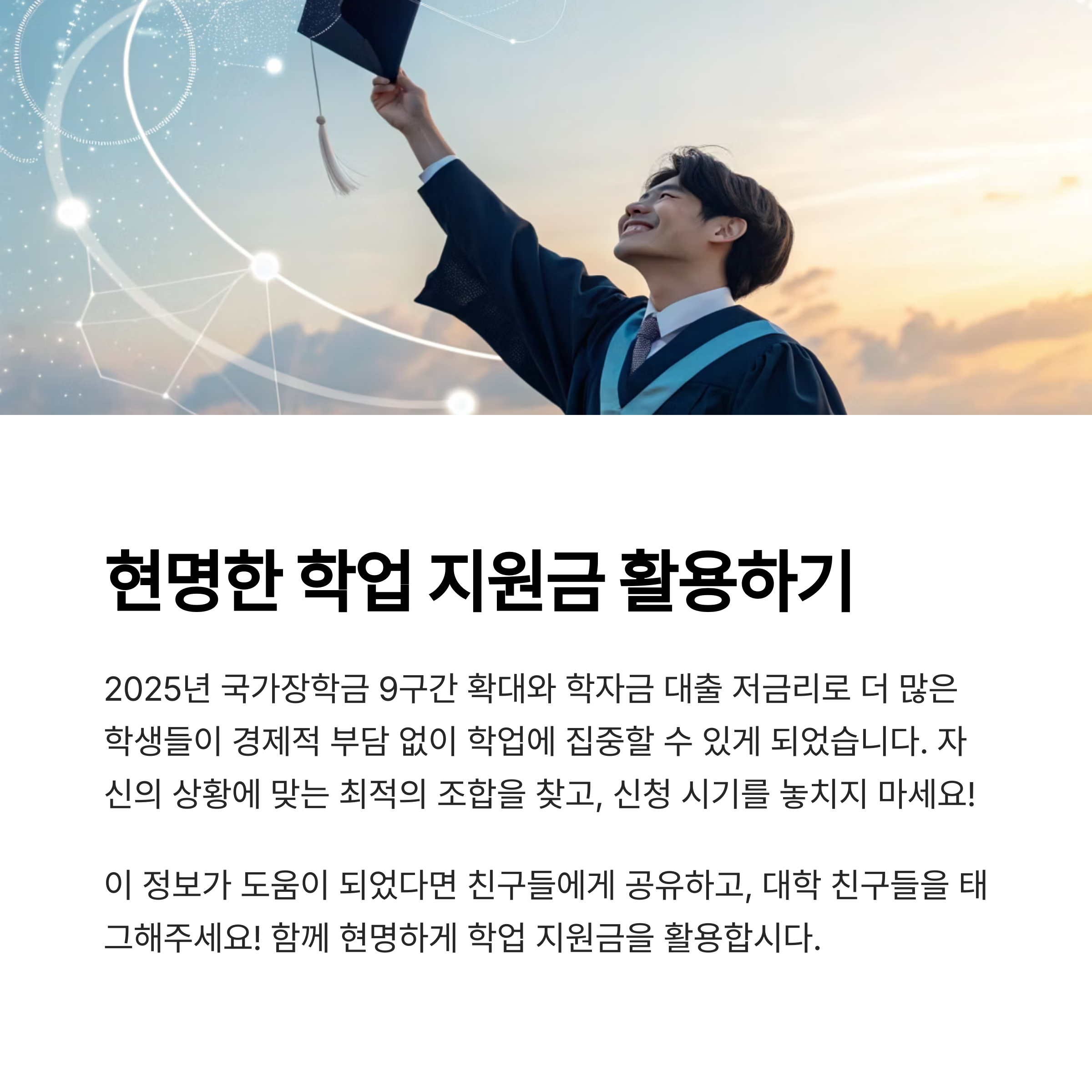 대학 4년은 인생의 중요한 시기입니다. 경제적 걱정 때문에 학업과 꿈을 포기하지 마시고, 정부의 다양한 지원제도를 적극 활용해서 알찬 대학생활을 만들어가시기 바랍니다.