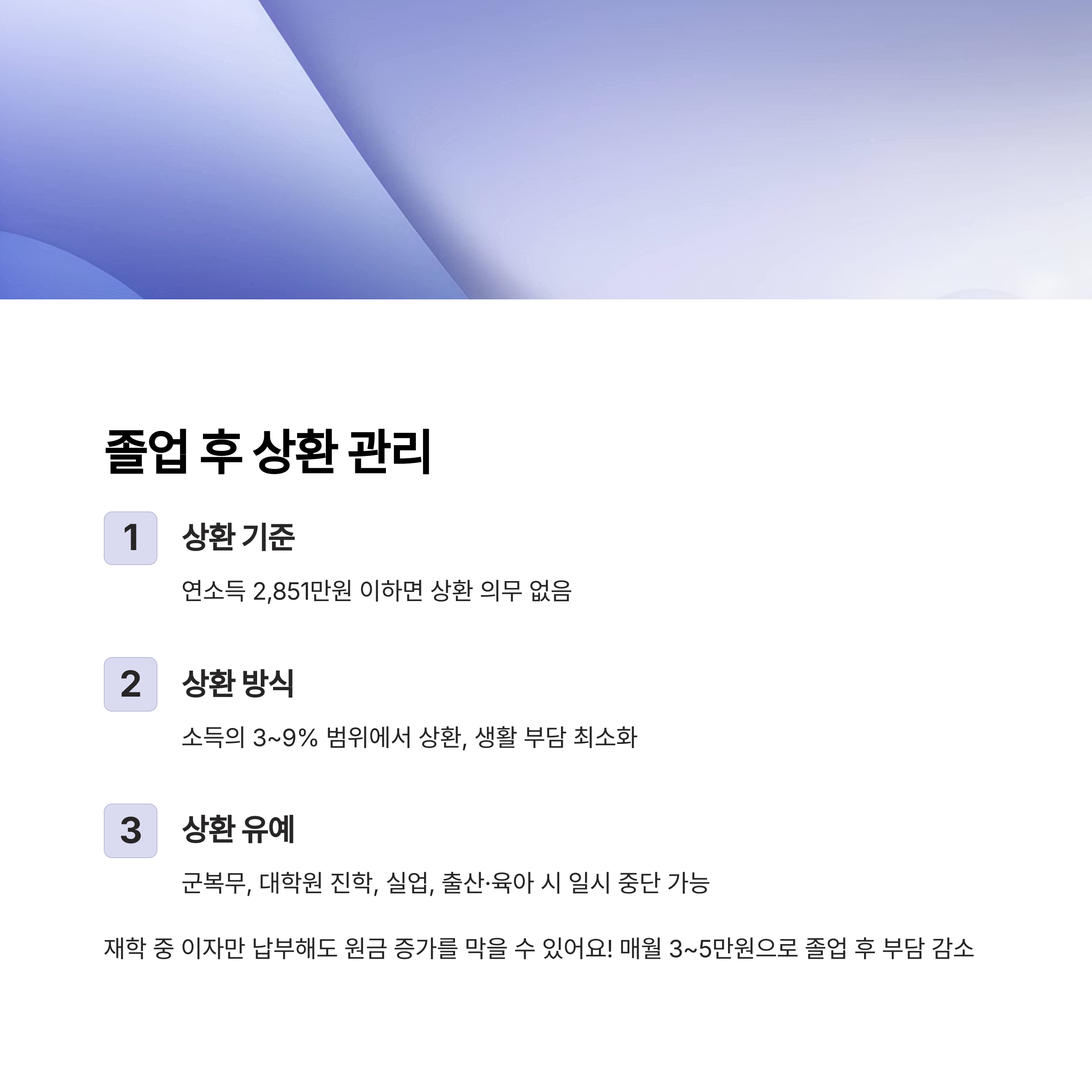 재학 중 이자만이라도 납부하면 원금 증가를 막을 수 있어요. 매월 3~5만 원 정도의 이자를 납부하면 졸업 후 상환 부담이 크게 줄어듭니다.