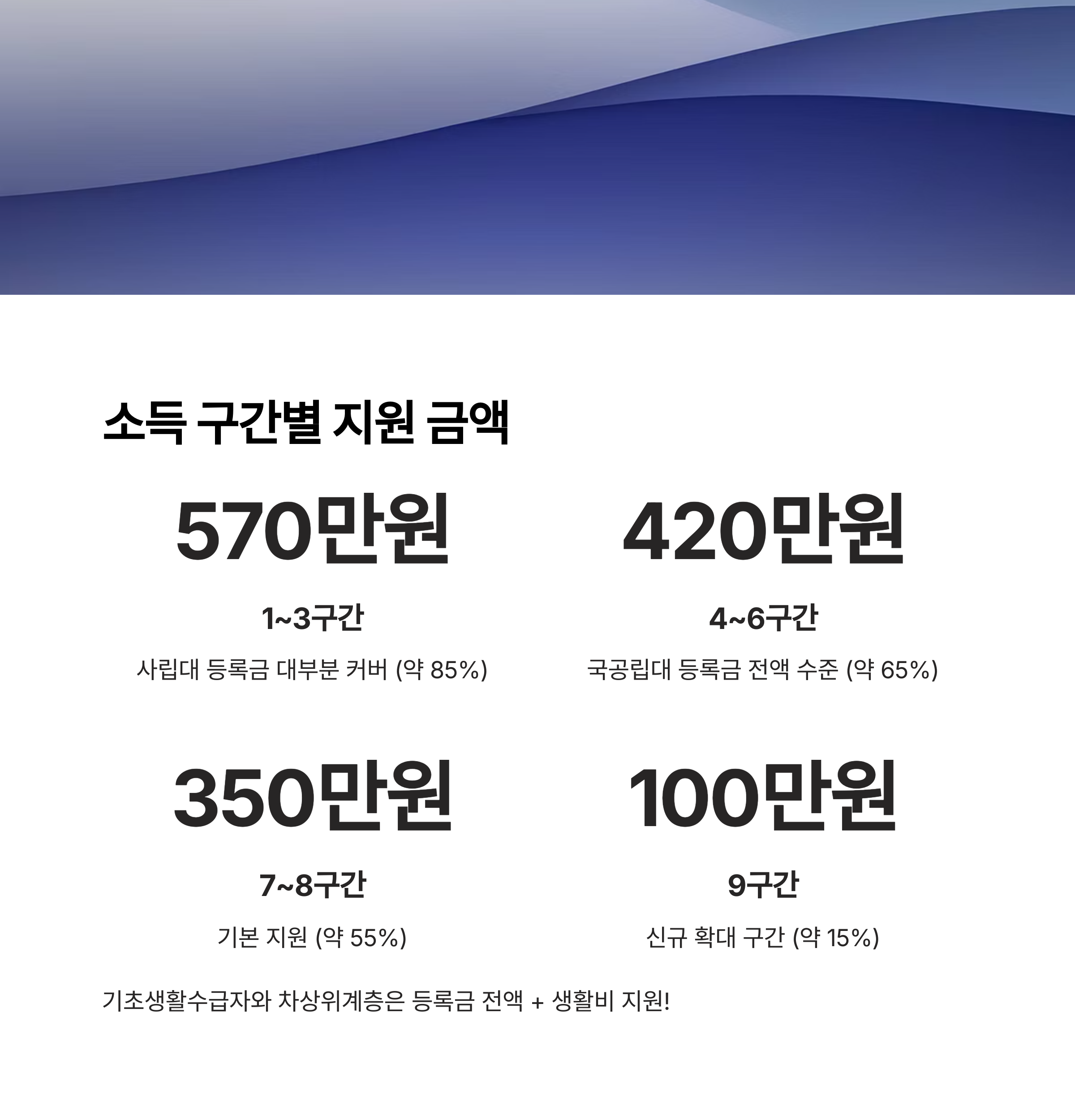 | 기초·차상위 | 등록금 전액 | 100% | 생활비 지원 추가 |
