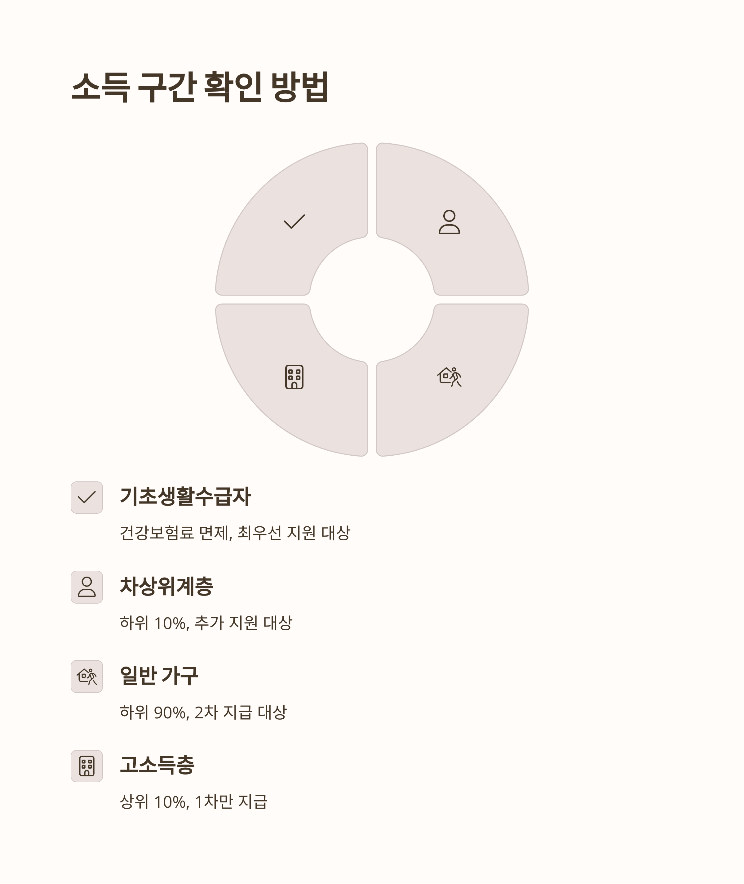 건강보험료 납부액을 기준으로 소득 구간이 산정됩니다. 지역가입자와 직장가입자의 기준이 다르므로, 본인이 어느 구간에 해당하는지 미리 확인해 보시는 것이 좋아요.