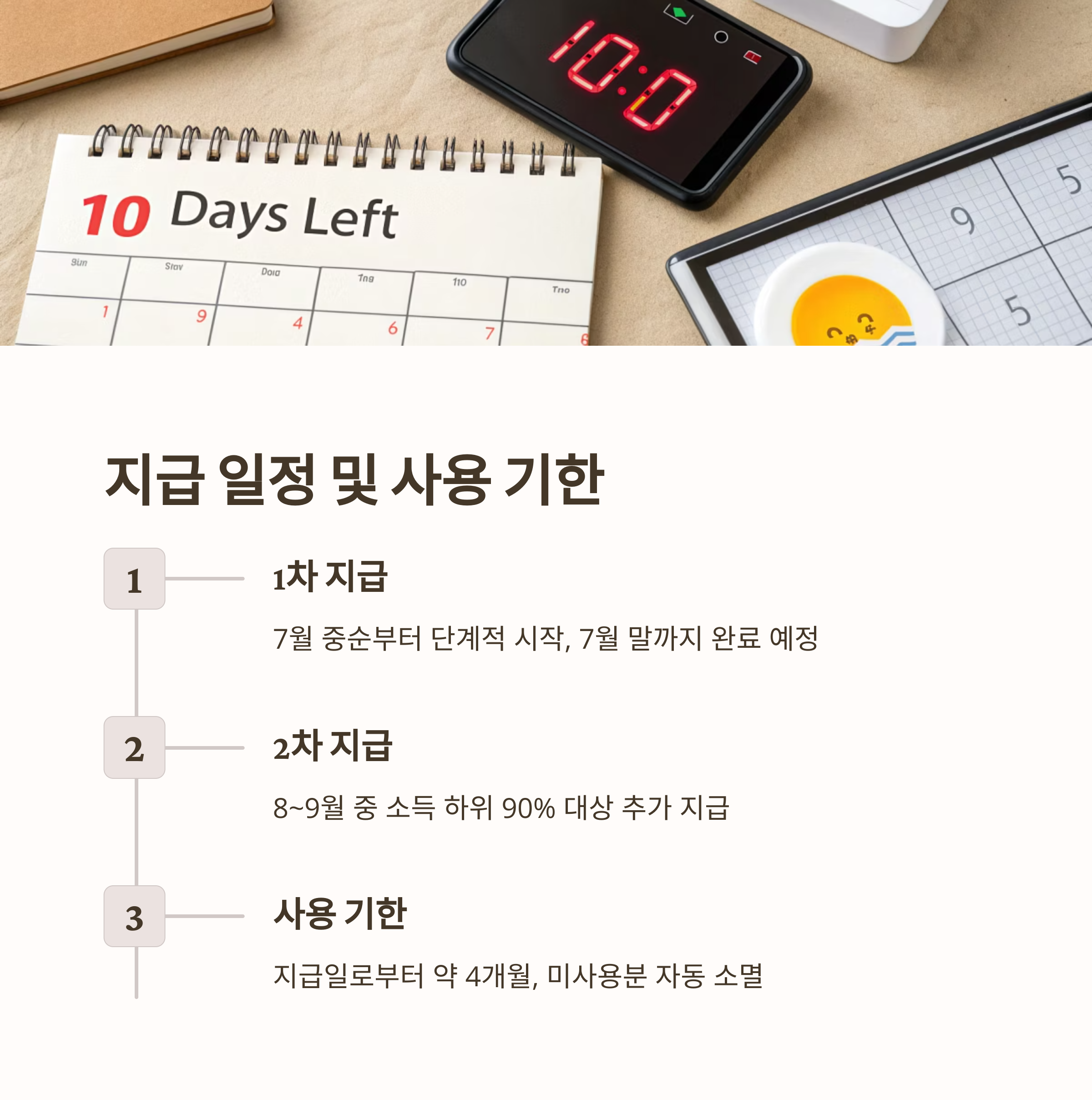 2차 지급은 8~9월 중 소득 하위 90%에게 추가로 10만 원이 지급됩니다. 건강보험료 납부액을 기준으로 소득 구간을 산정하여, 상위 10%를 제외한 모든 국민이 추가 혜택을 받게 됩니다.