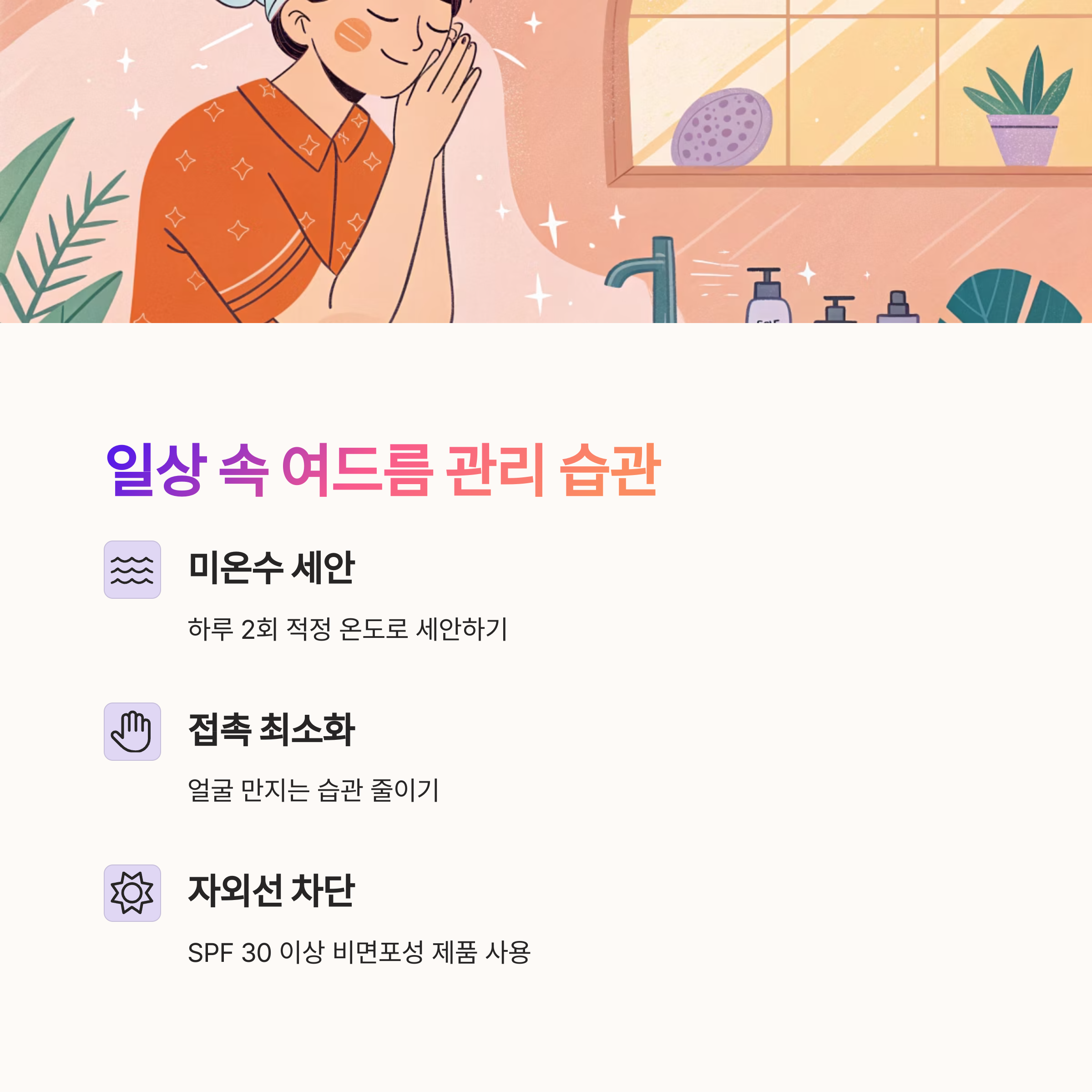 하루 2회 미온수로 세안하고, 손으로 얼굴을 만지는 습관을 줄이고,
