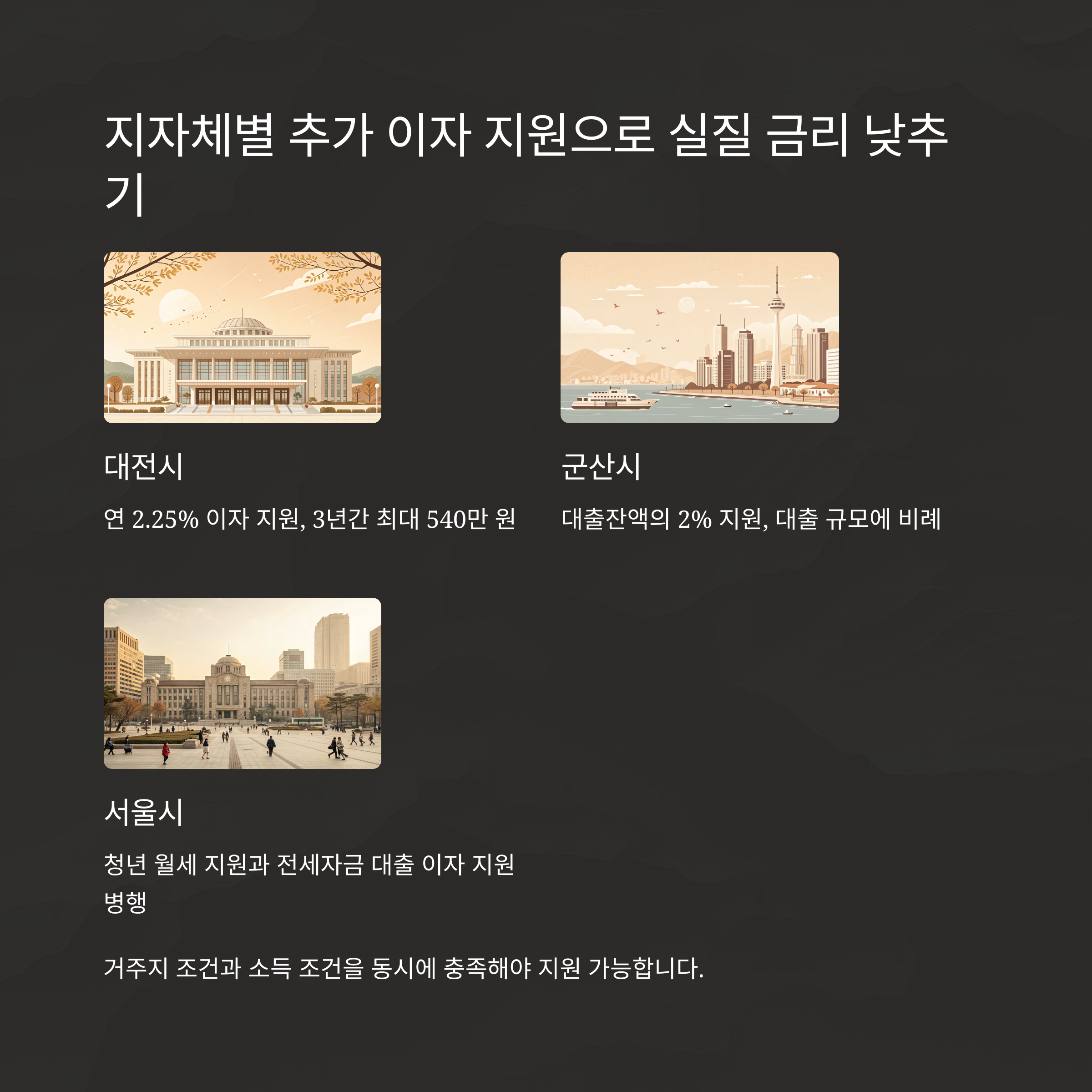 대전시는 가장 적극적인 지원을 하는 지자체 중 하나로, 청년 및 신혼부부에게 연 2.25%의 이자를 직접 지원한다. 3년간 최대 540만 원까지 지원받을 수 있어 실질적인 주거비 절감 효과가 크다. 군산시는 대출잔액의 2%를 지원하는 방식으로, 대출 규모가 클수록 더 많은 혜택을 받을 수 있는 구조이다.