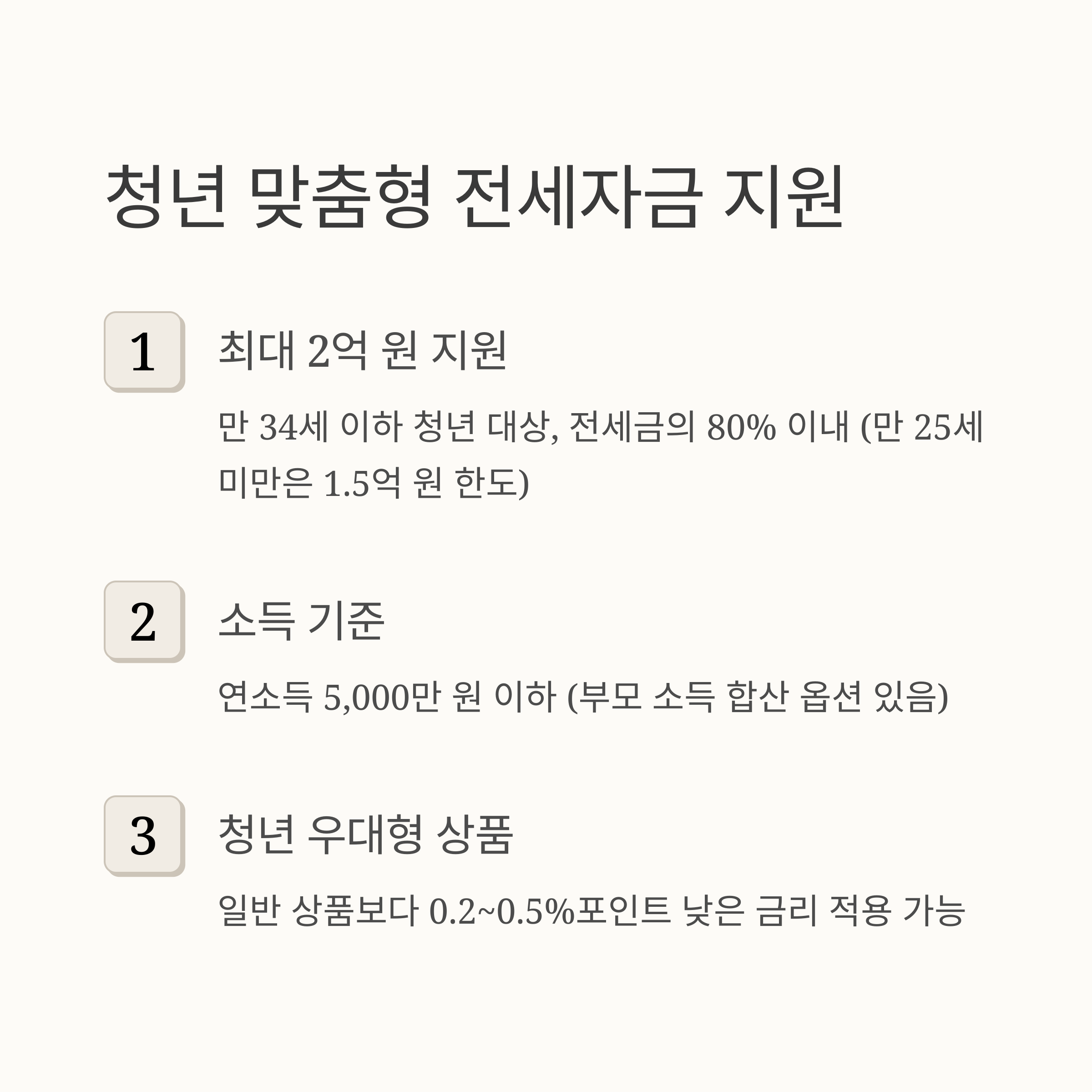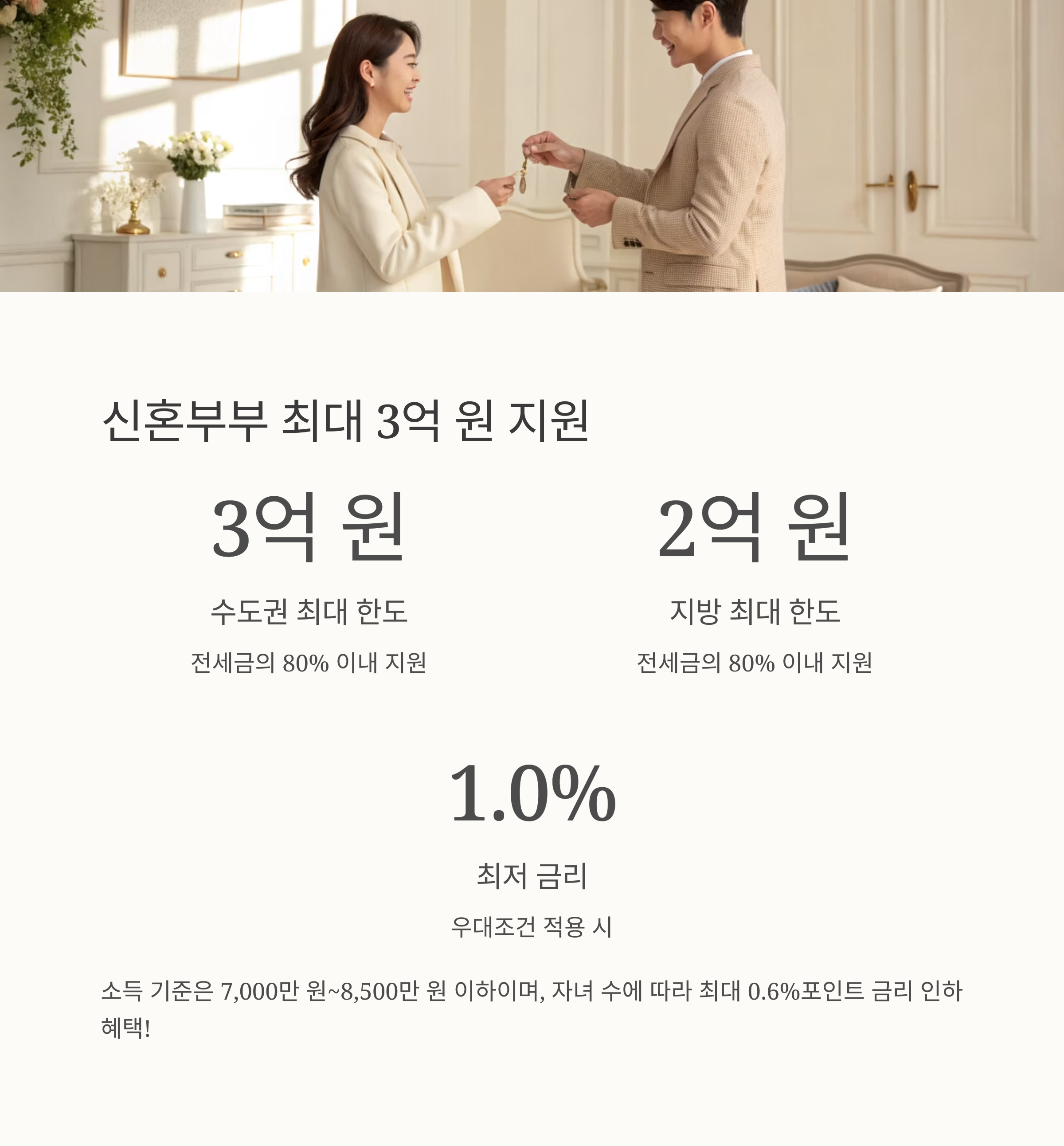 | 신혼부부 버팀목 | 최대 3억 원 | 최대 2억 원 | 연 2.3~3.3% | 7,000~8,500만 원 이하 |