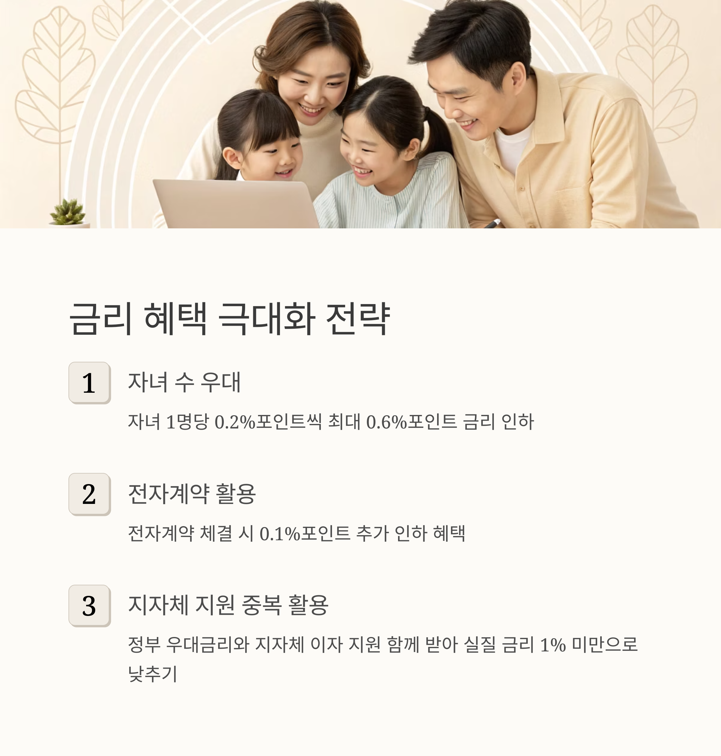 자녀 수에 따른 우대금리가 가장 큰 혜택이다. 자녀 1명당 0.2%포인트씩 최대 0.6% 포인트까지 금리가 인하되므로, 자녀가 많은 신혼부부일수록 유리하다. 전자계약 우대금리는 0.1%포인트 인하로 작지만 별다른 조건 없이 받을 수 있어 반드시 활용해야 한다.