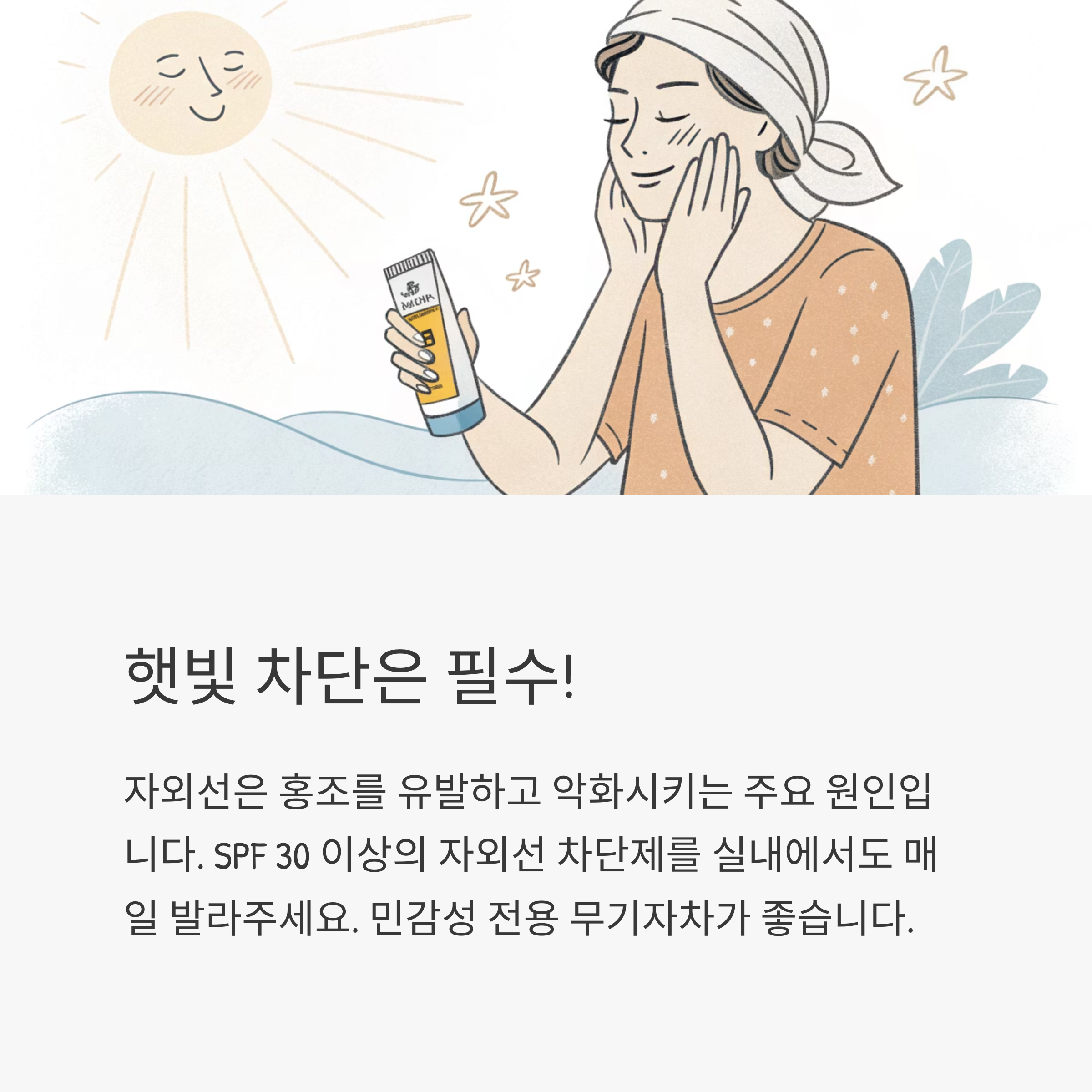 무기자차나 민감성 전용 차단제를 꾸준히 사용하는 것이 중요합니다.