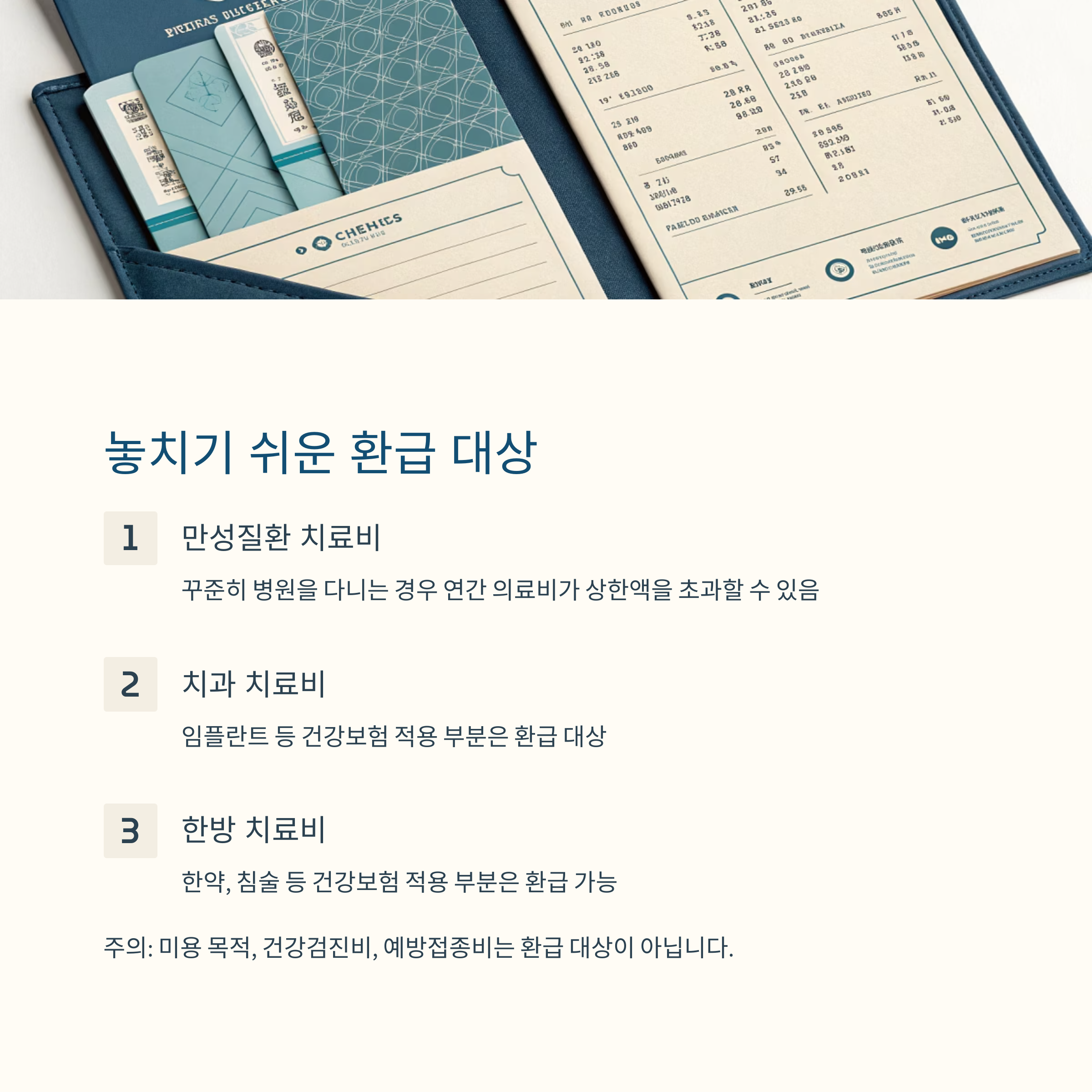 주의하셔야 할 점은 미용 목적이나 건강검진비, 예방접종비 등은 환급 대상이 아니라는 것입니다. 치료 목적의 의료비만 해당되니까 이 부분은 꼭 기억해 두세요.