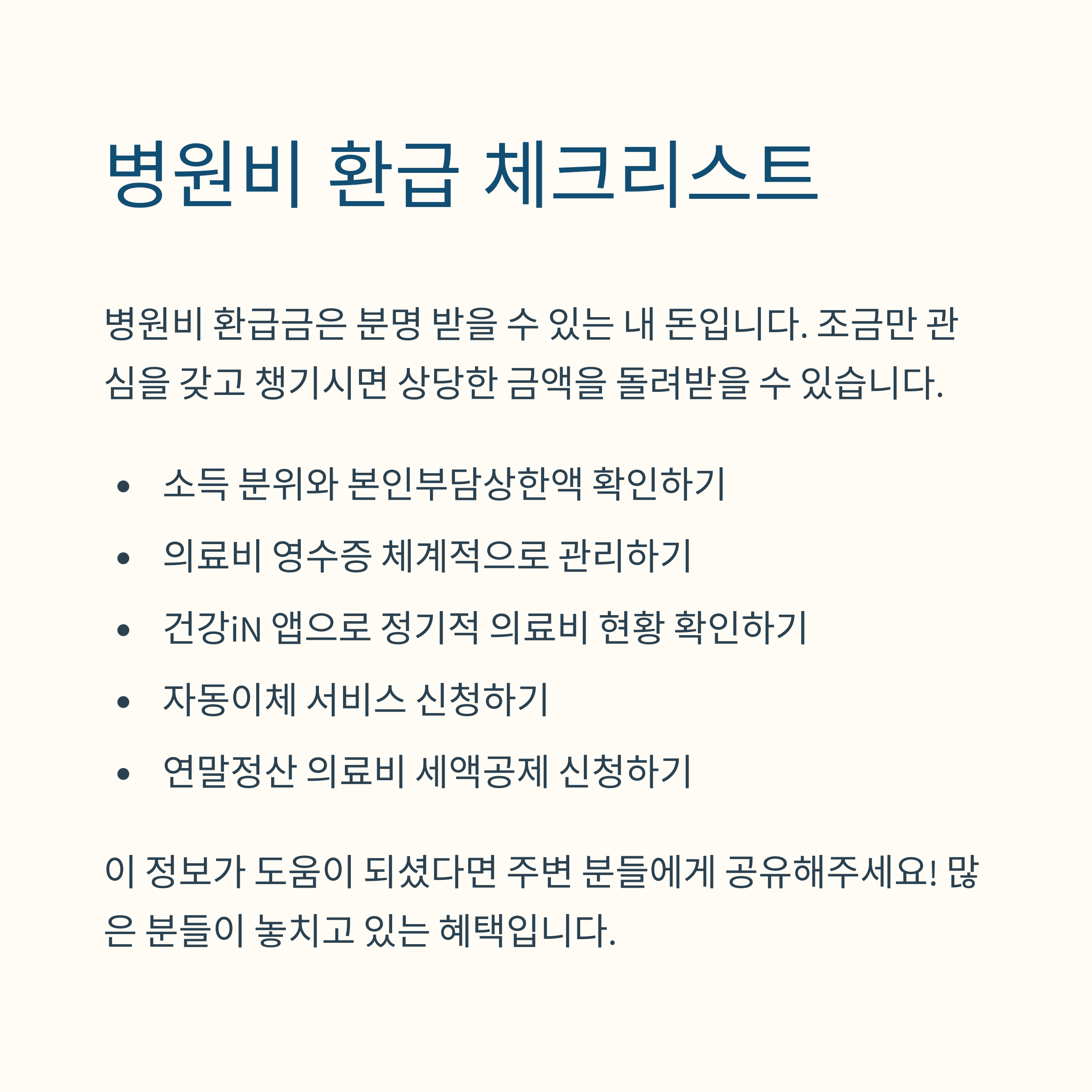 병원비 환급금은 분명 받을 수 있는 내 돈입니다. 조금만 관심을 갖고 챙기시면 상당한 금액을 돌려받을 수 있으니까, 꼭 놓치지 마시고 신청하시길 바랍니다!