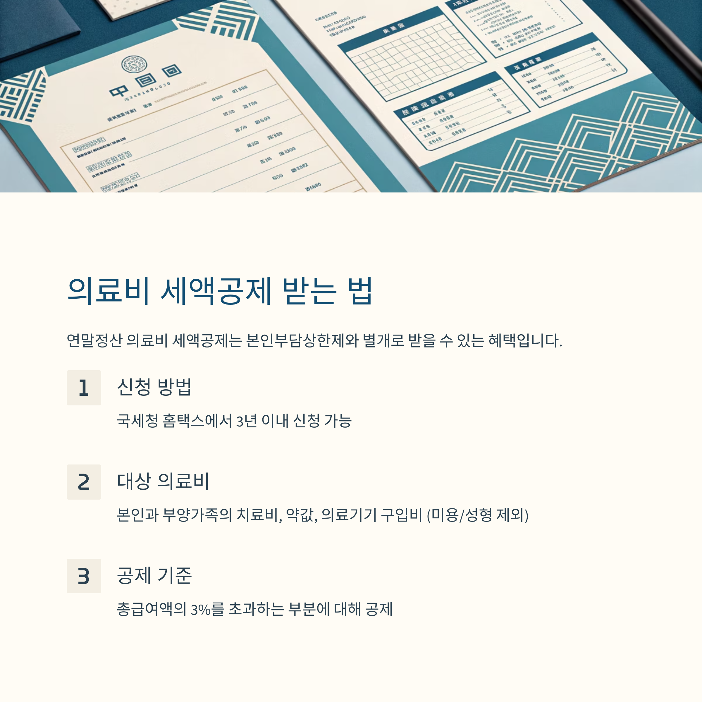 공제 대상이 되는 의료비는 본인과 부양가족의 치료비, 약값, 의료기기 구입비 등입니다. 미용이나 성형 목적이 아닌 치료 목적이어야 하고, 총급여액의 3%를 초과하는 부분에 대해서만 공제받을 수 있습니다.