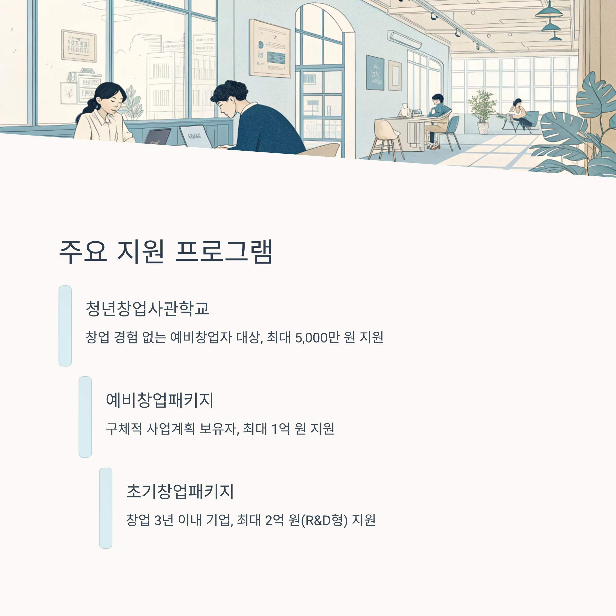 예비창업자부터 창업 3년 이내까지 폭넓게 지원하며, 자금뿐만 아니라 교육·멘토링·입주공간까지 제공하는 종합 패키지입니다.
