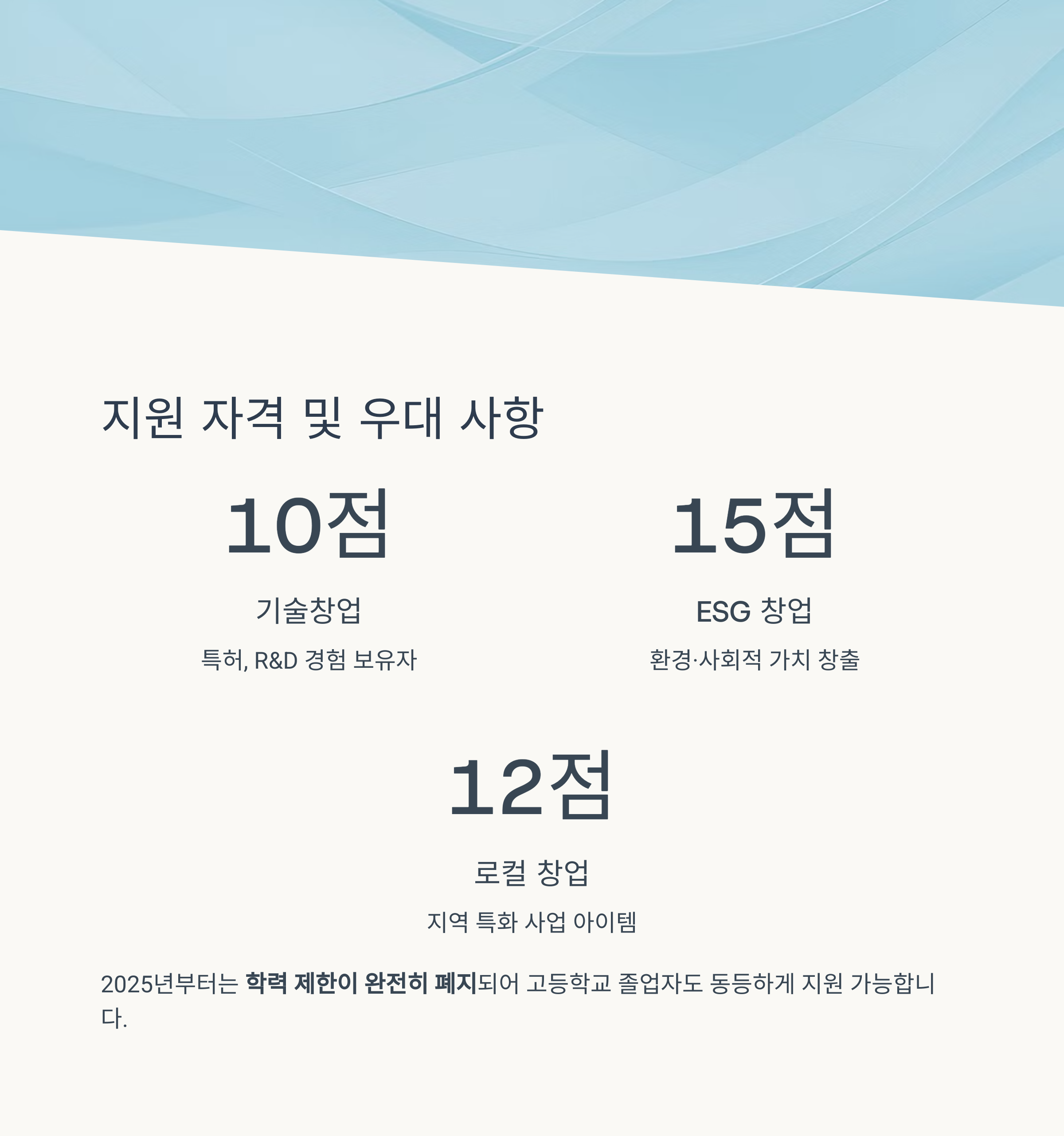 만 19~39세 대한민국 국민이면 누구나 신청 가능하며, 예비창업자와 창업 3년 이내 사업자 모두 지원할 수 있습니다. 2025년부터는 학력 제한이 완전히 폐지되어 고등학교 졸업자도 동등하게 지원받을 수 있어요.
