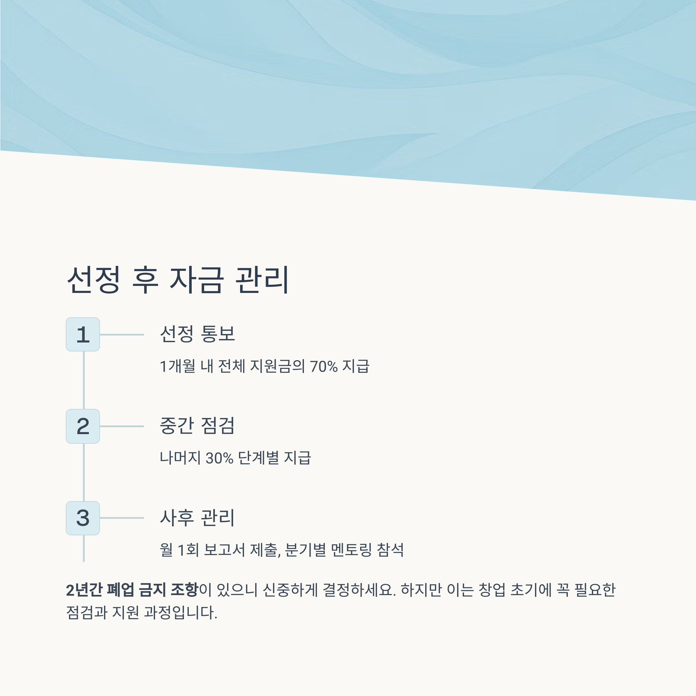 지원금을 받은 후에는 월 1회 사업 진행 보고서 제출과 분기별 멘토링 참석이 의무입니다. 또한 2년간 폐업 금지 조항이 있어 신중하게 결정해야 해요.