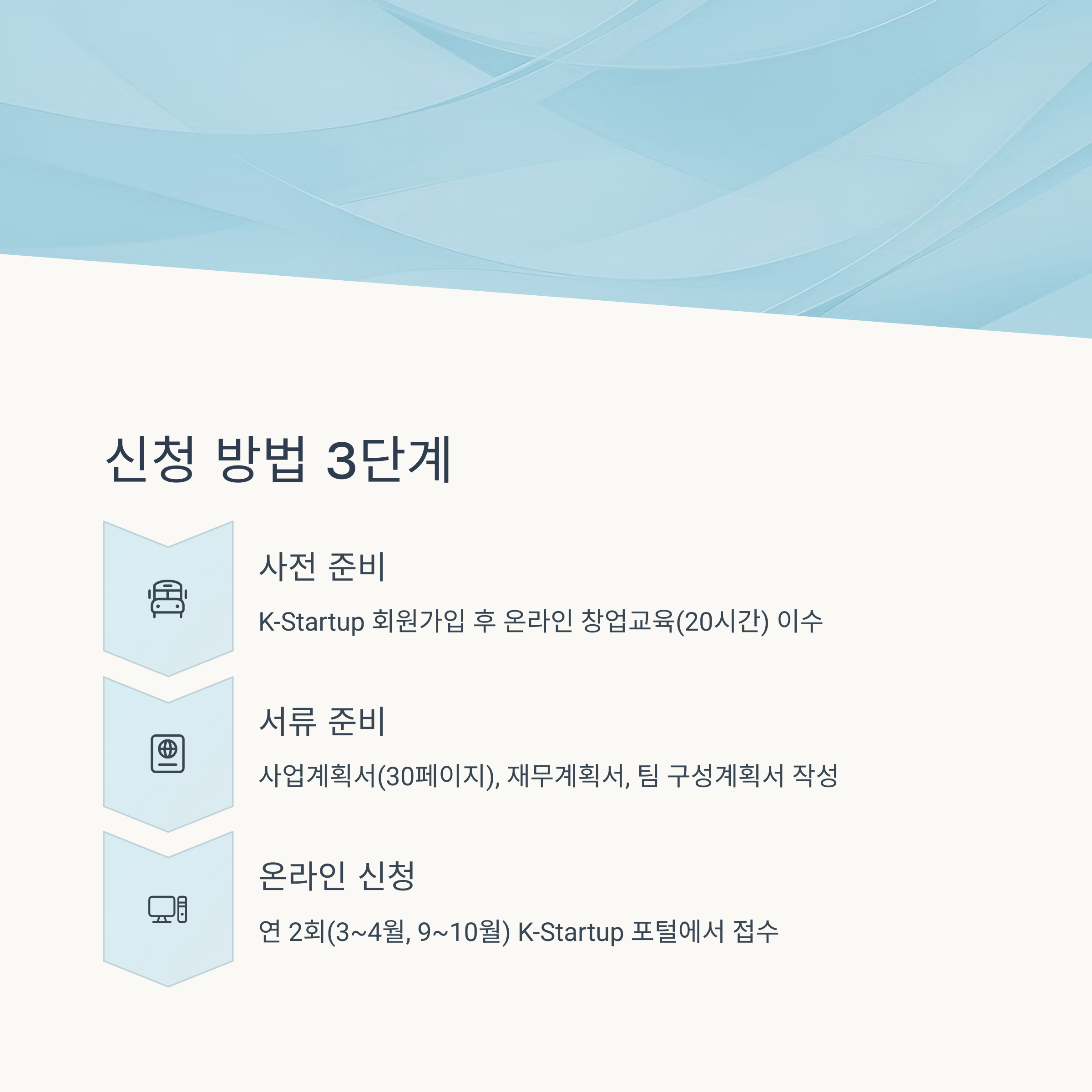 K-Startup 홈페이지에서 회원가입 후 창업교육 이수가 필수입니다. 기본 창업교육은 온라인으로 약 20시간 정도 소요되며, 이수증이 있어야 신청할 수 있어요.